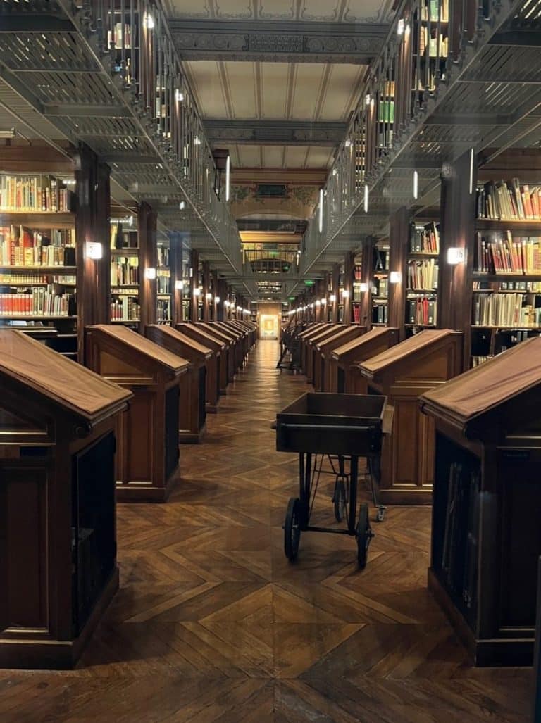 Etter en god halvtimes kø slipper jeg inn i den drømmeaktige forhaven til det tidligere palasset til kardinal Mazarin, som består av smale stier mellom tropiske palmer og høyt strågress. Inne i biblioteksbygningen åpner så den berømte salen seg foran meg med en majestetisk oval glasshvelving som troner over de mange leseplassene. Jeg kan ikke unngå å bli imponert. Etasjer med bokhyller omkranser rommet, og jeg føler meg både liten og mektig når jeg skuer utover. Har de tusenvis av mennesker som har fordypet seg i tekster her gjennom tidene, følt den samme høytideligheten når de trådte inn i dette rommet?